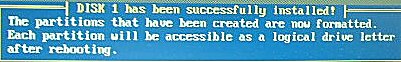 ![]() 作成されたパーティションは(DMで)フォーマットされた。各々のパーティションは 再起動後に論理ドライブとして利用できると書かれています。 下へどういう風に抜けたかは判りませんが、画面下部(下図)の表示に従えば 移動できると思います。ESCのようです。 |